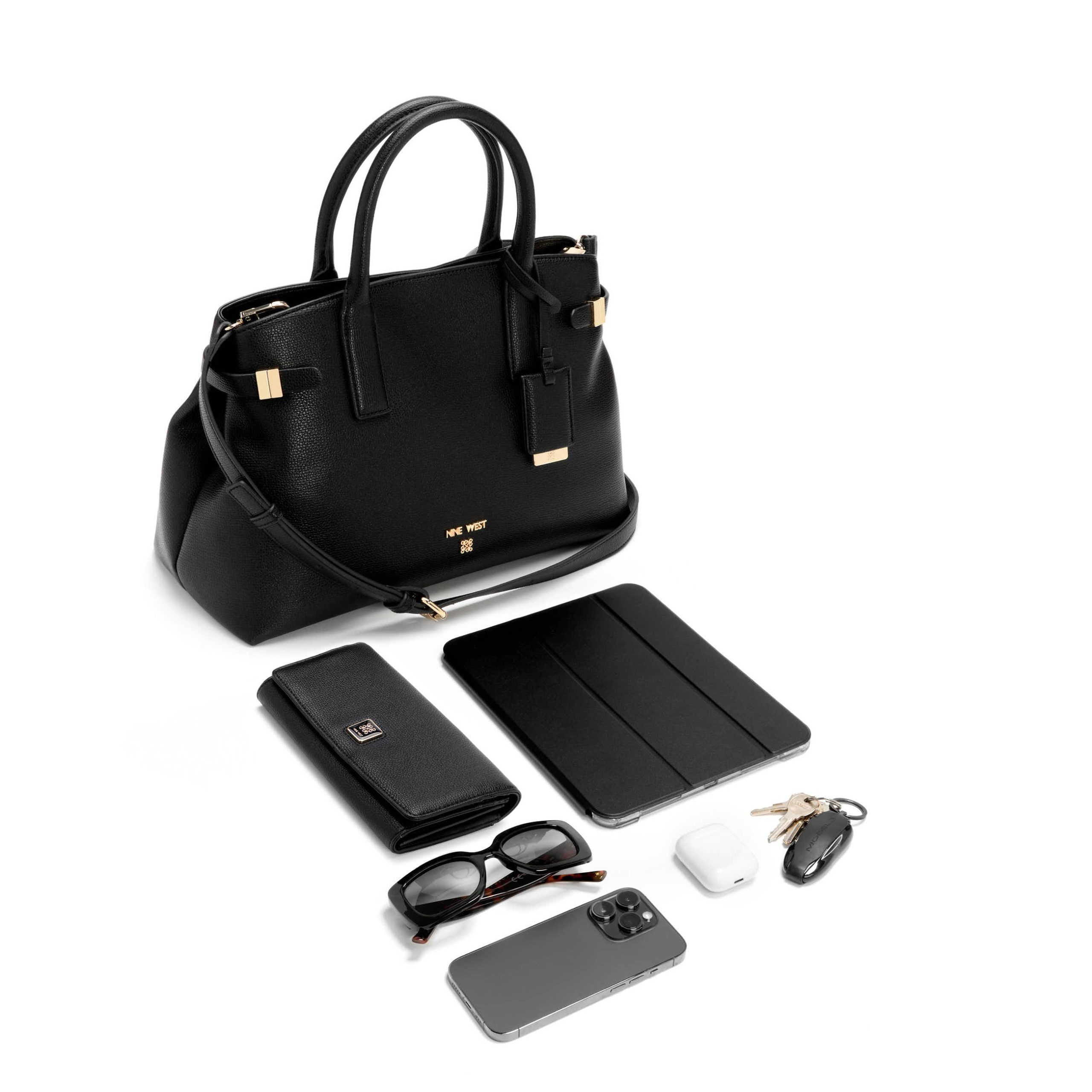 Nine West designer Aira satchel designed with buckle hardware elements. Internal slip and zipper pocket organization and external branding. Converts to crossbody for hands free ease.
