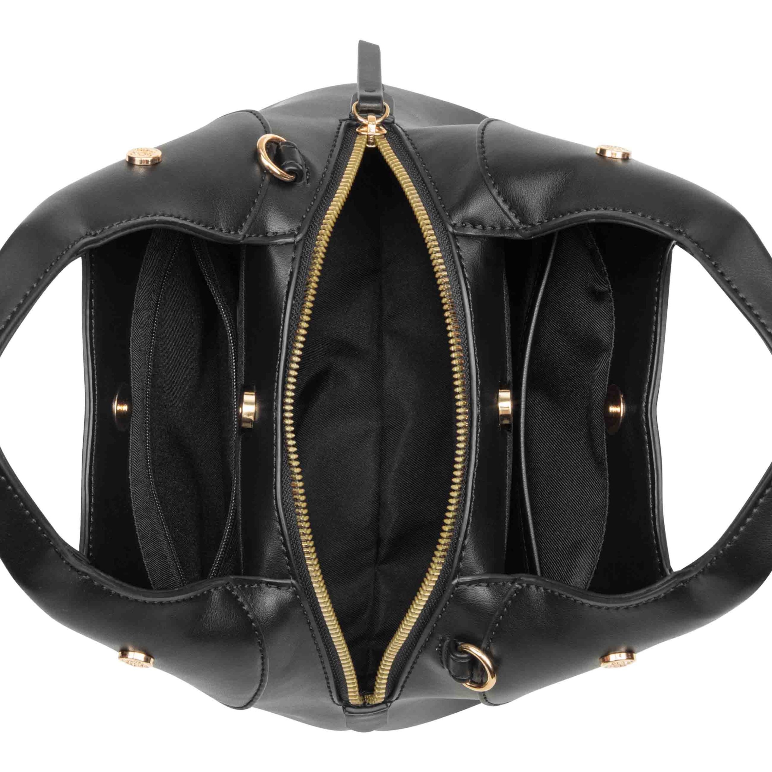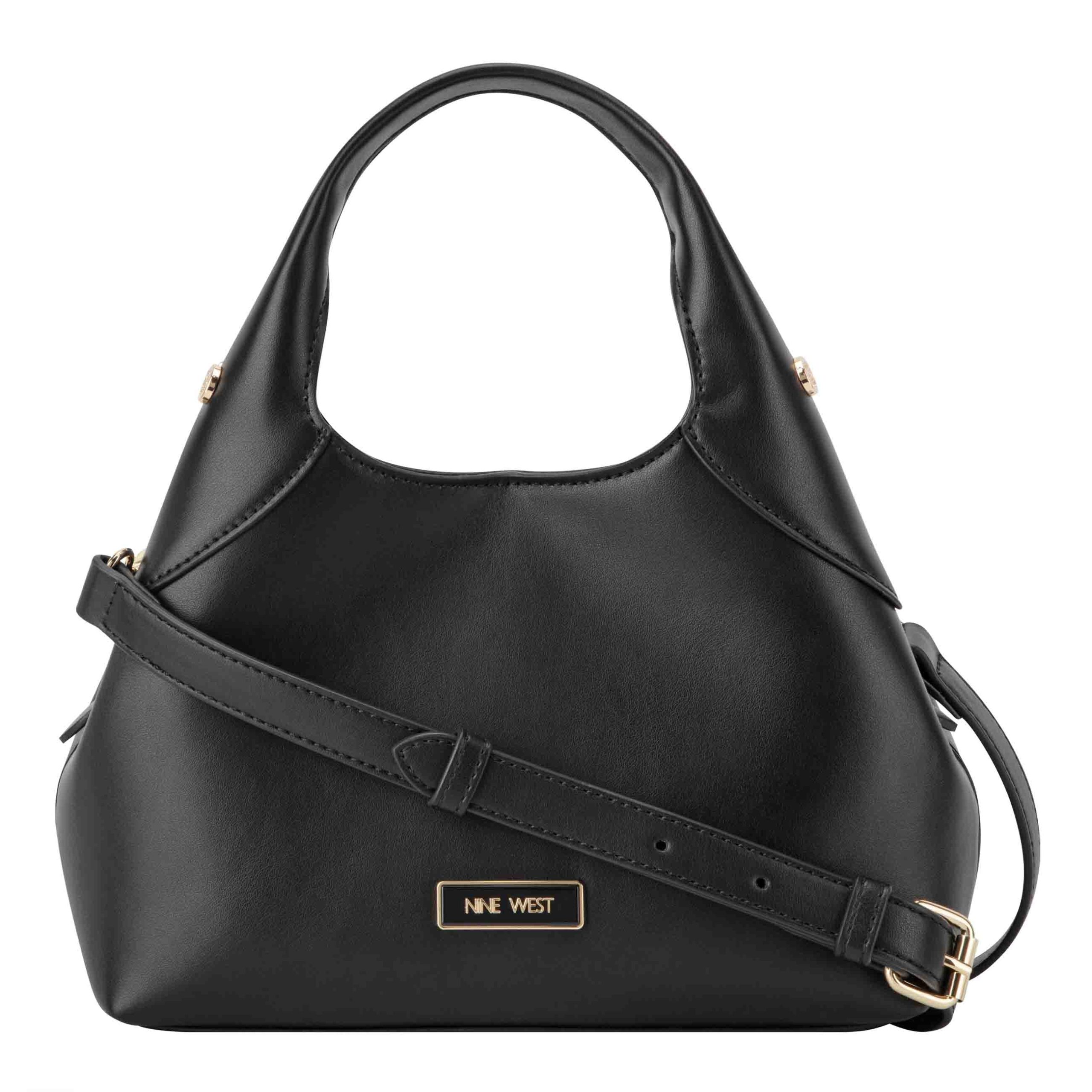 Nine West Designer Eamon in smaller version of the signature carryall with triple compartment function. Top zipper with 2 magnetic compartments and interior organization pockets. Special branding with gold. Perfect for all you essentials and everyday bag. Wear as a top handle or hands free crossbody with removable strap.