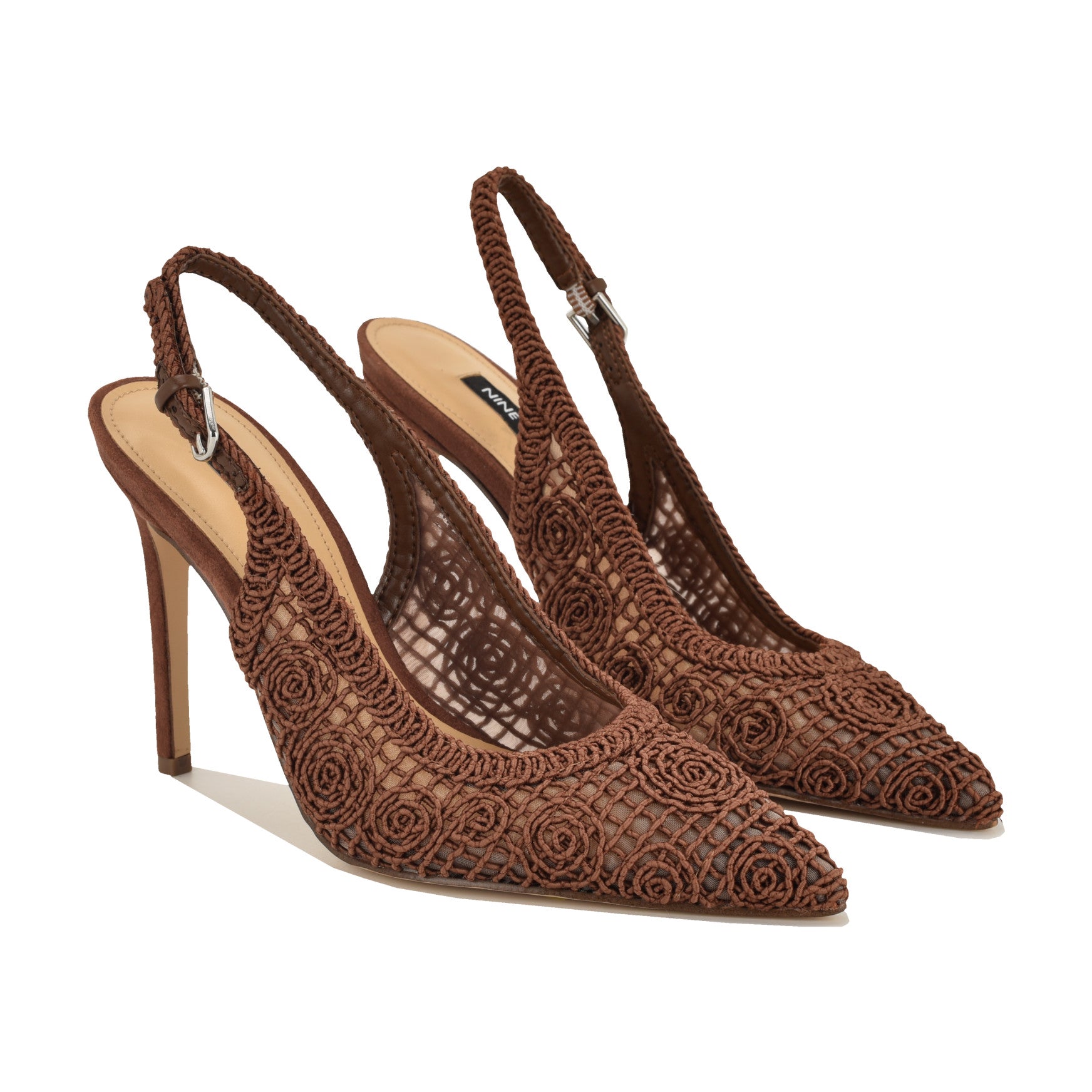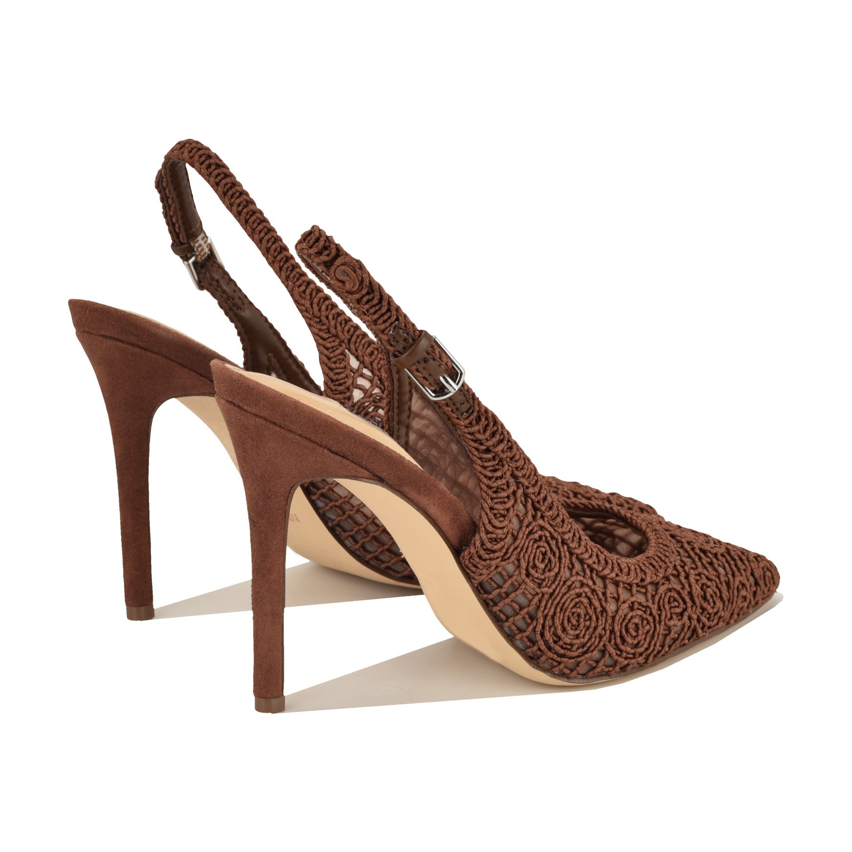 Intricate rosette embroidery over sheer mesh on a stiletto slingback? The Fantels is the kind of pump that stops people mid-sentence. A pointed toe. a woven slingback strap with buckle closure. and a high stiletto heel give this one the presence your next event deserves. Materials vary by color.