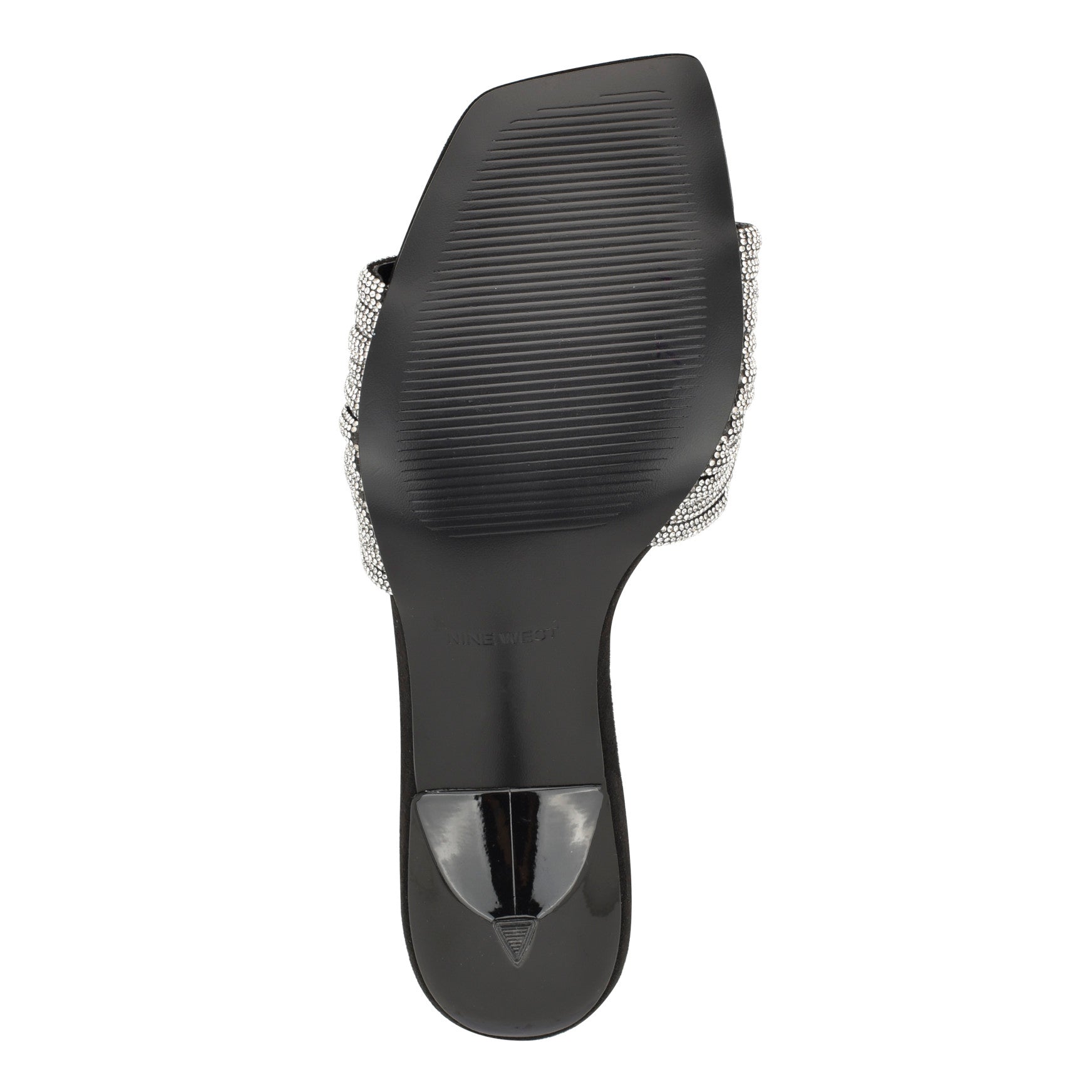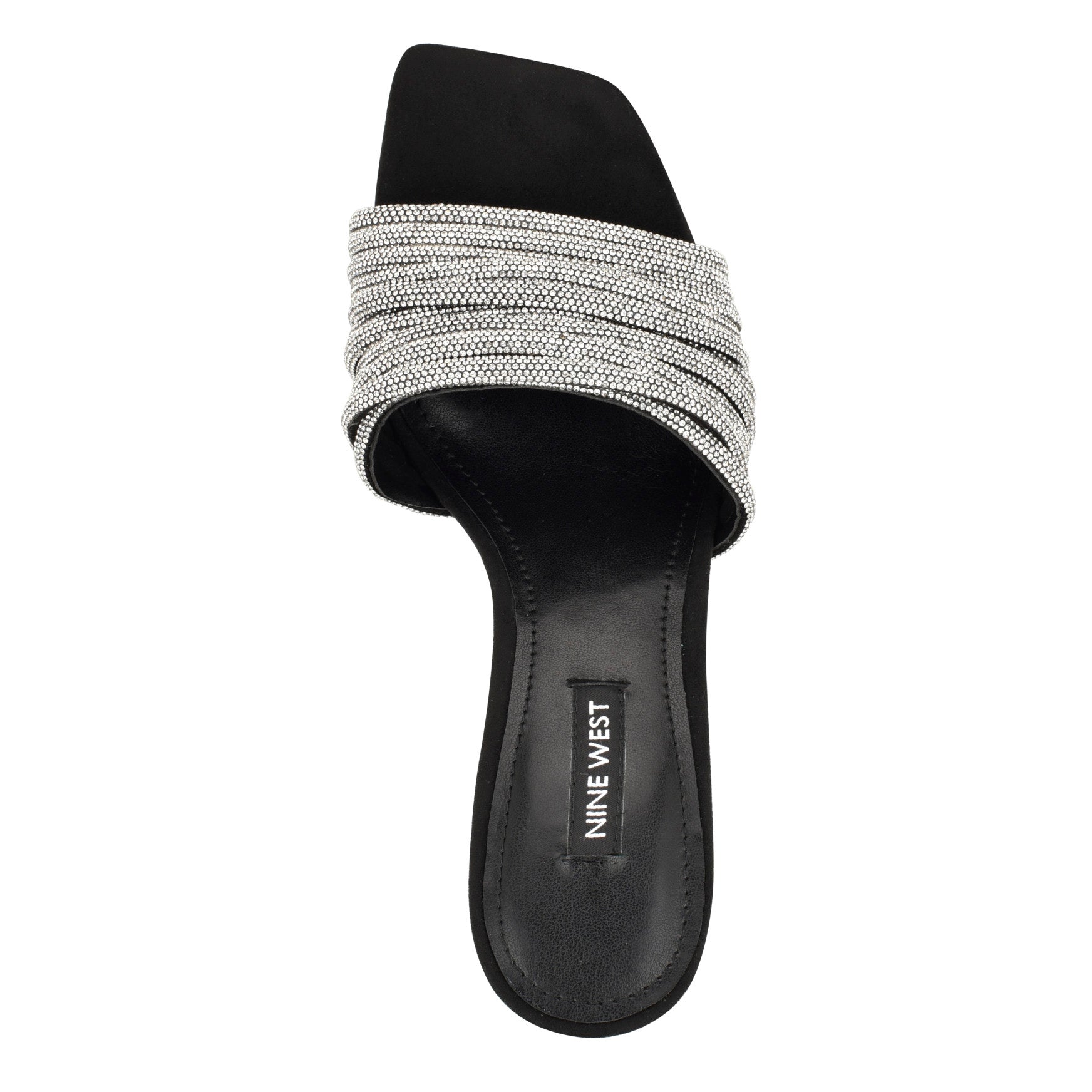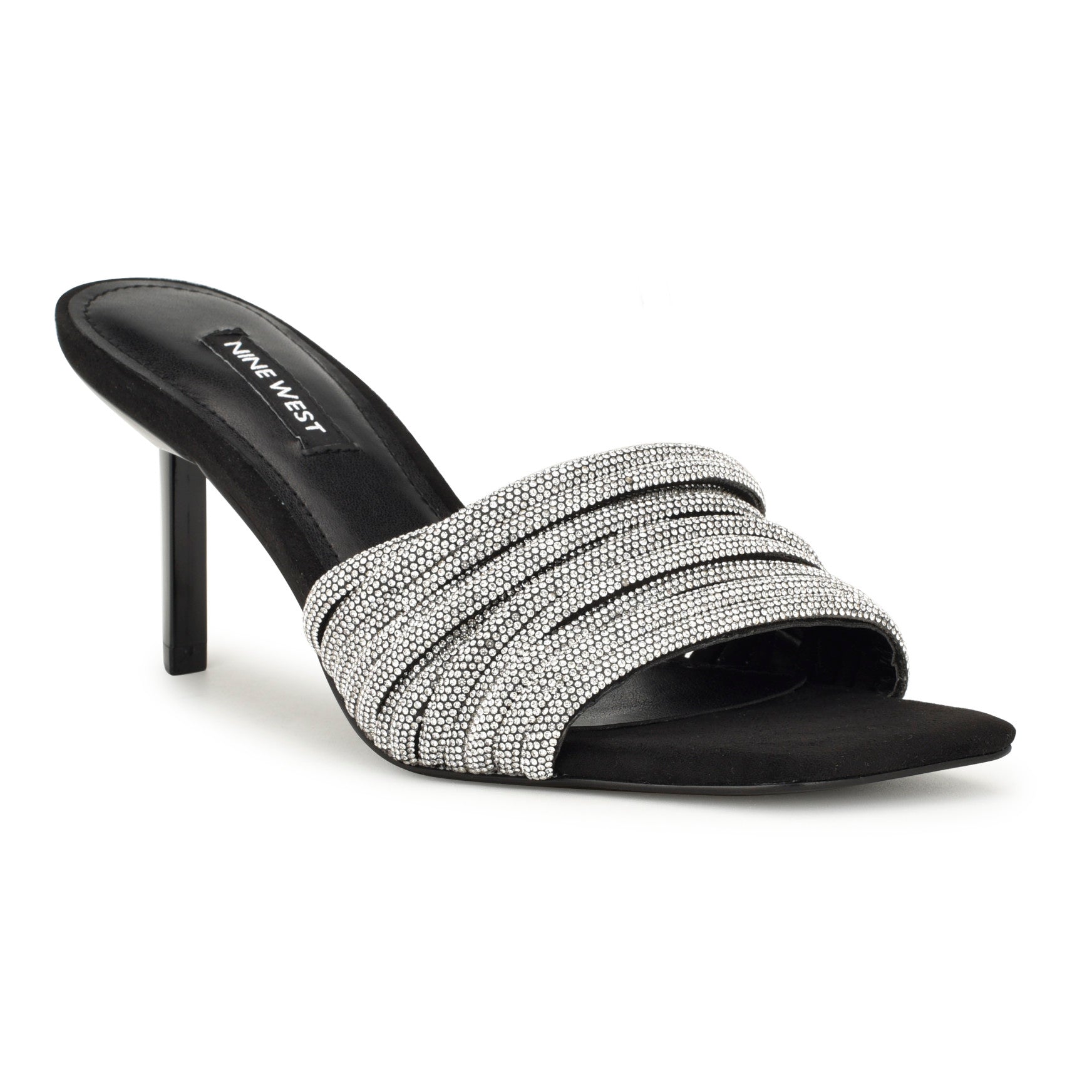 Every event needs a main character shoe. and the Harbor is it. This heeled slide sandal features rows of crystal-encrusted bands across a wide vamp. a sleek stiletto heel. and a modern square toe that catches light from every angle. Slip-on ease. statement-making sparkle. zero effort required. Materials vary by color.