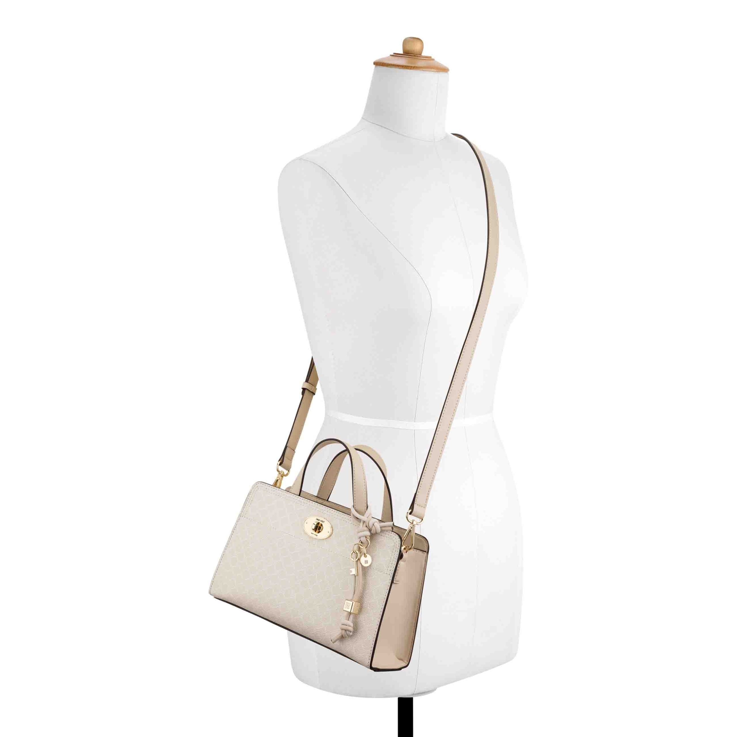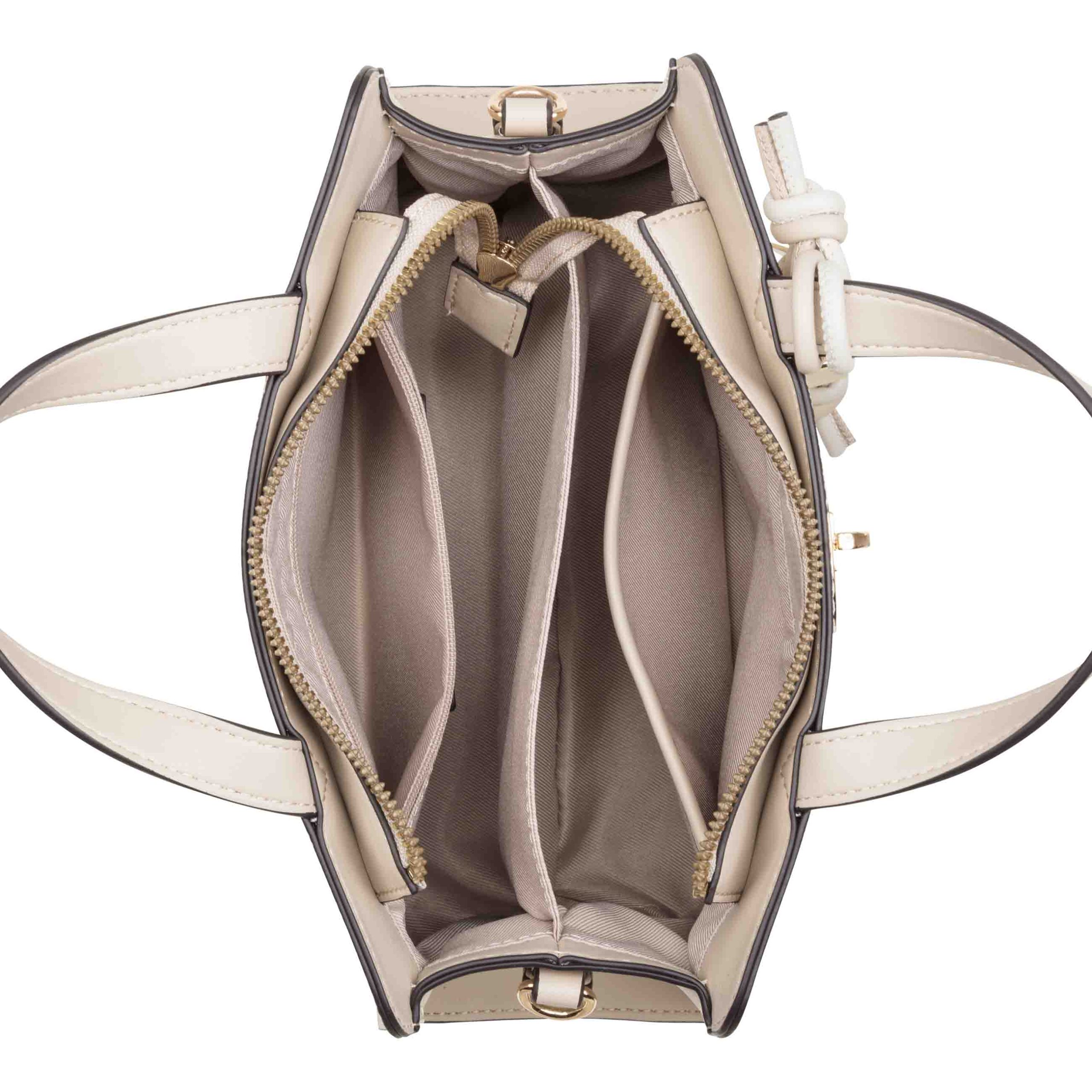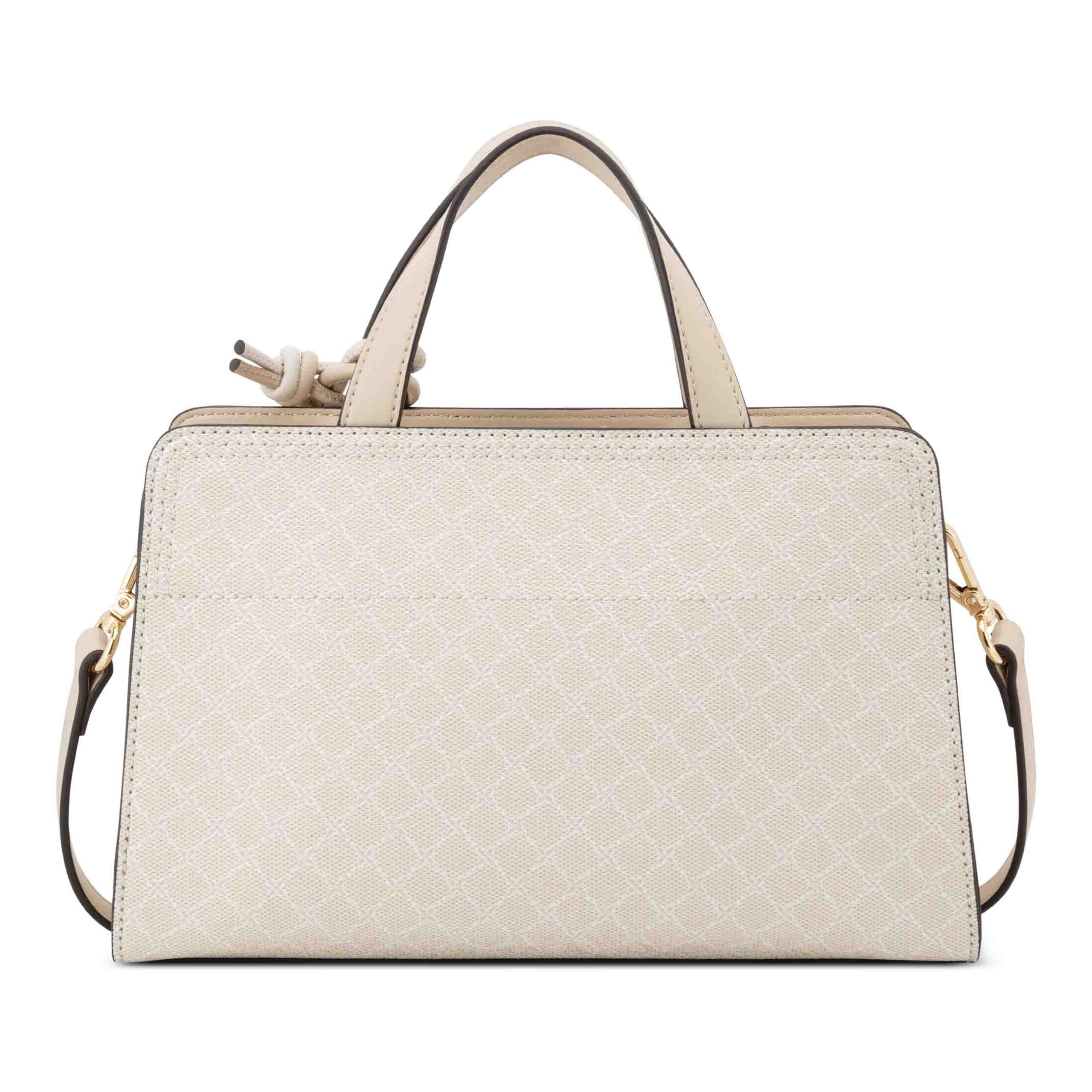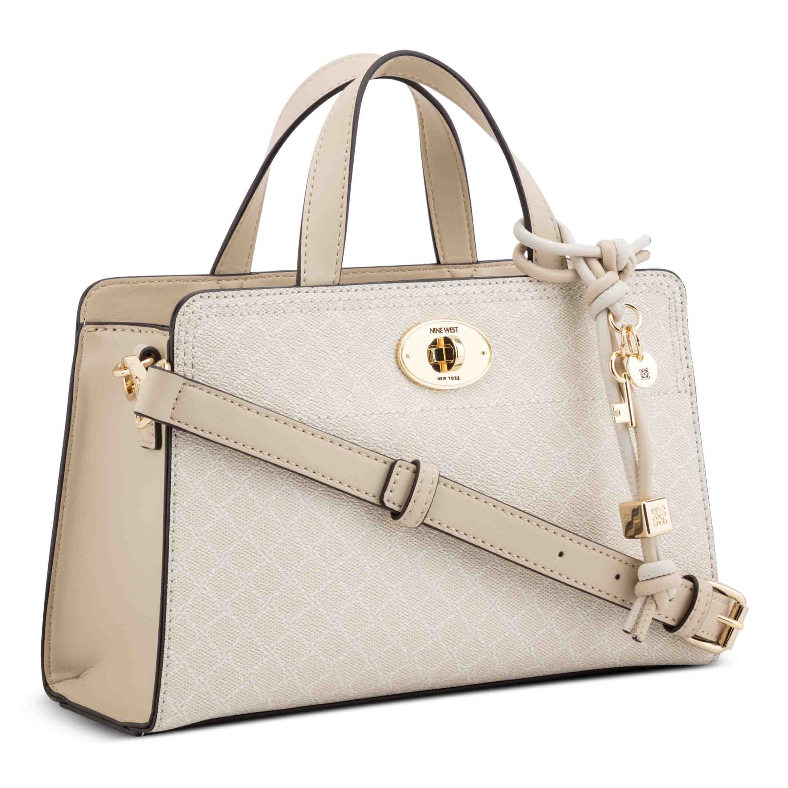 Nine West designer mini satchel crossbody with internal slip and zipper pocket organization and external hardware details and branding. Chain detail strap silhouette