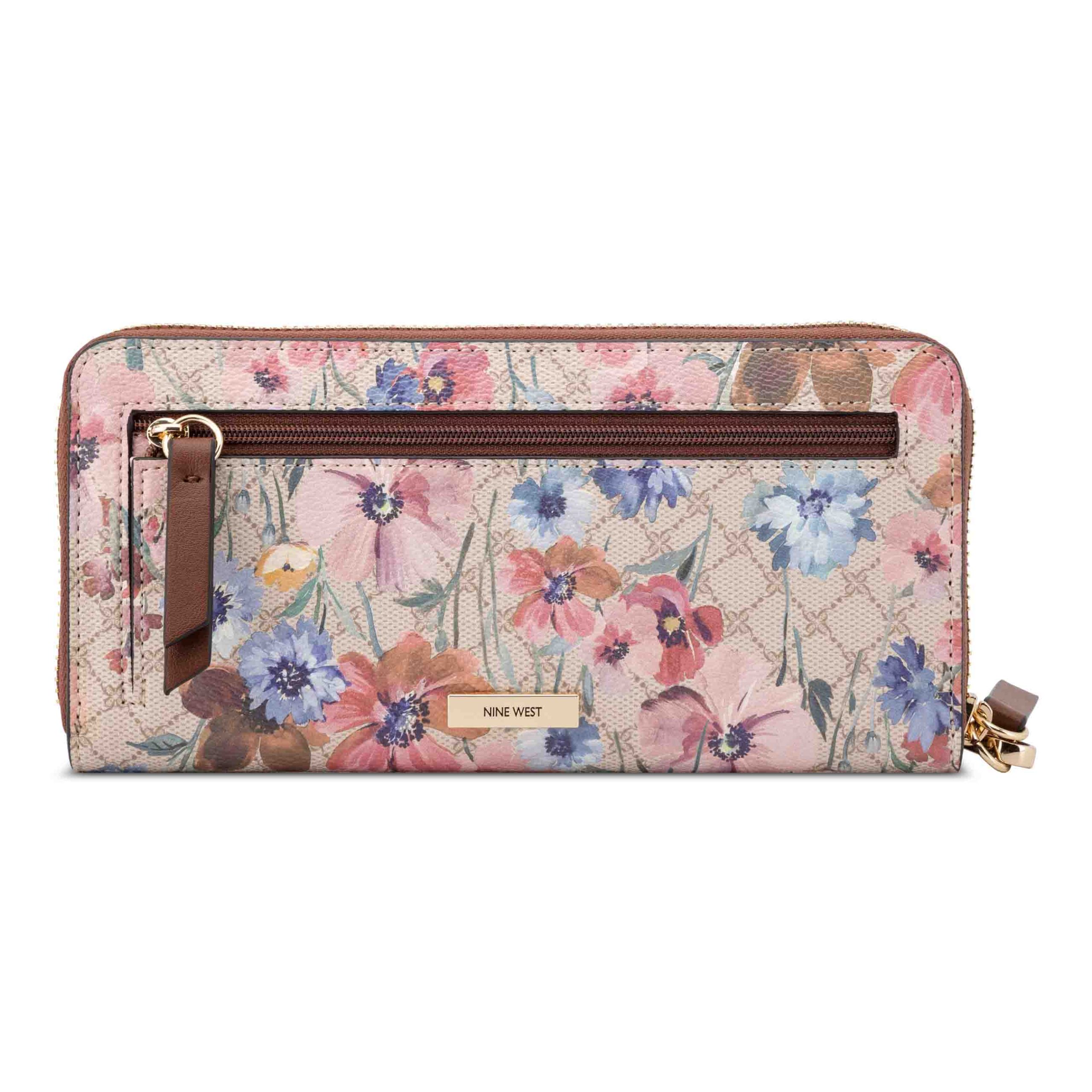 Nine West designer zip around with wristlet with internal slip and zipper pocket organization and external hardware details and branding as well as back zipper pocket. Removable wristlet