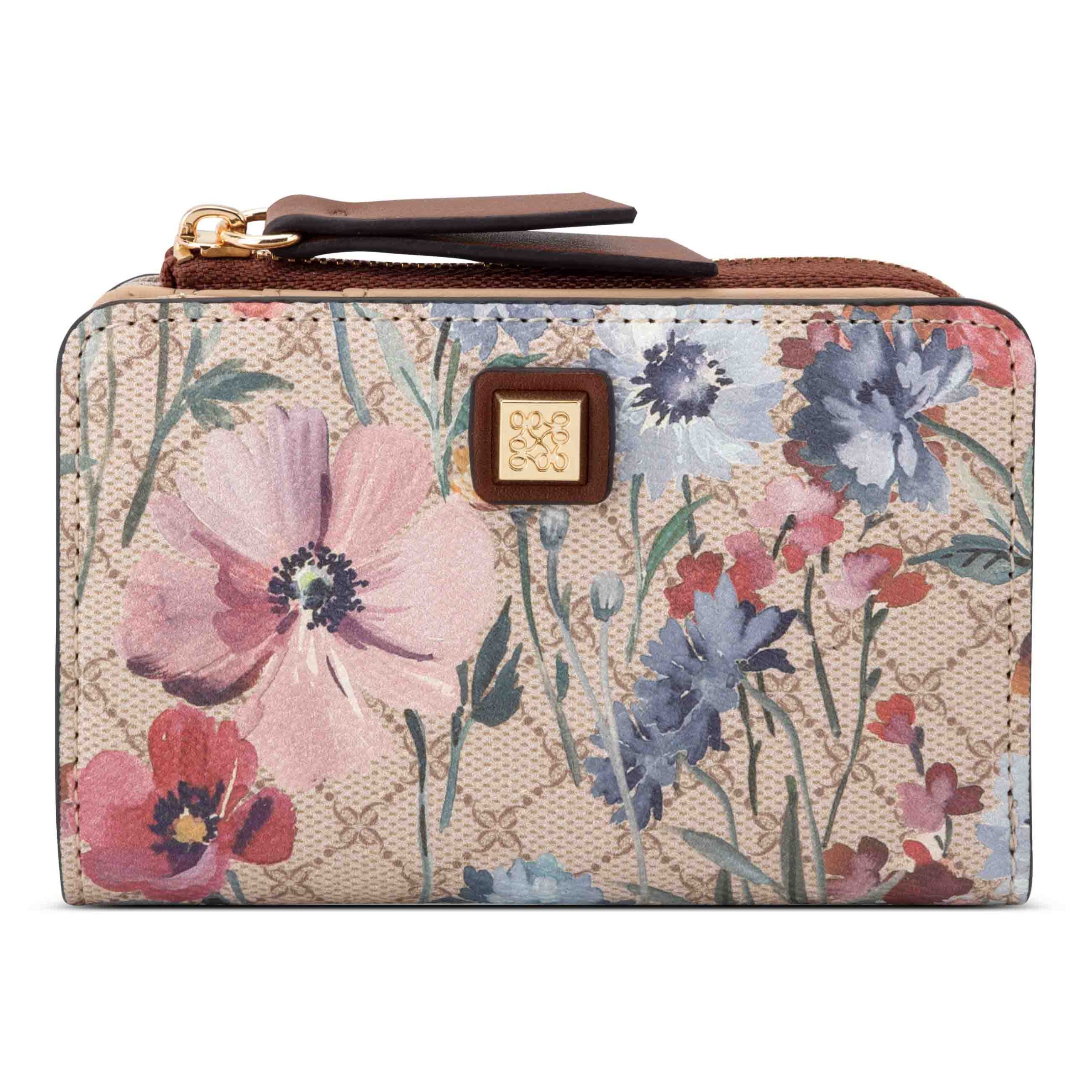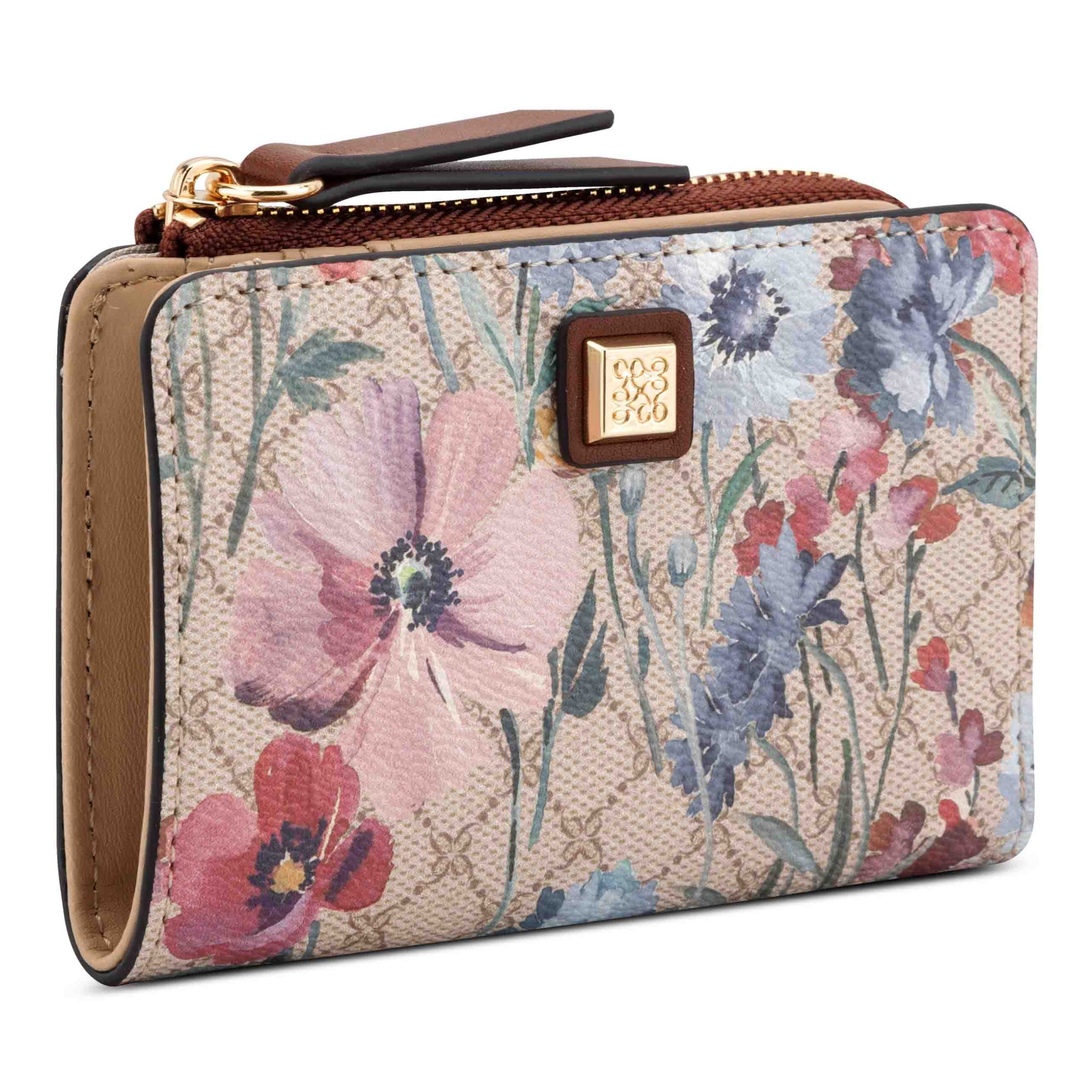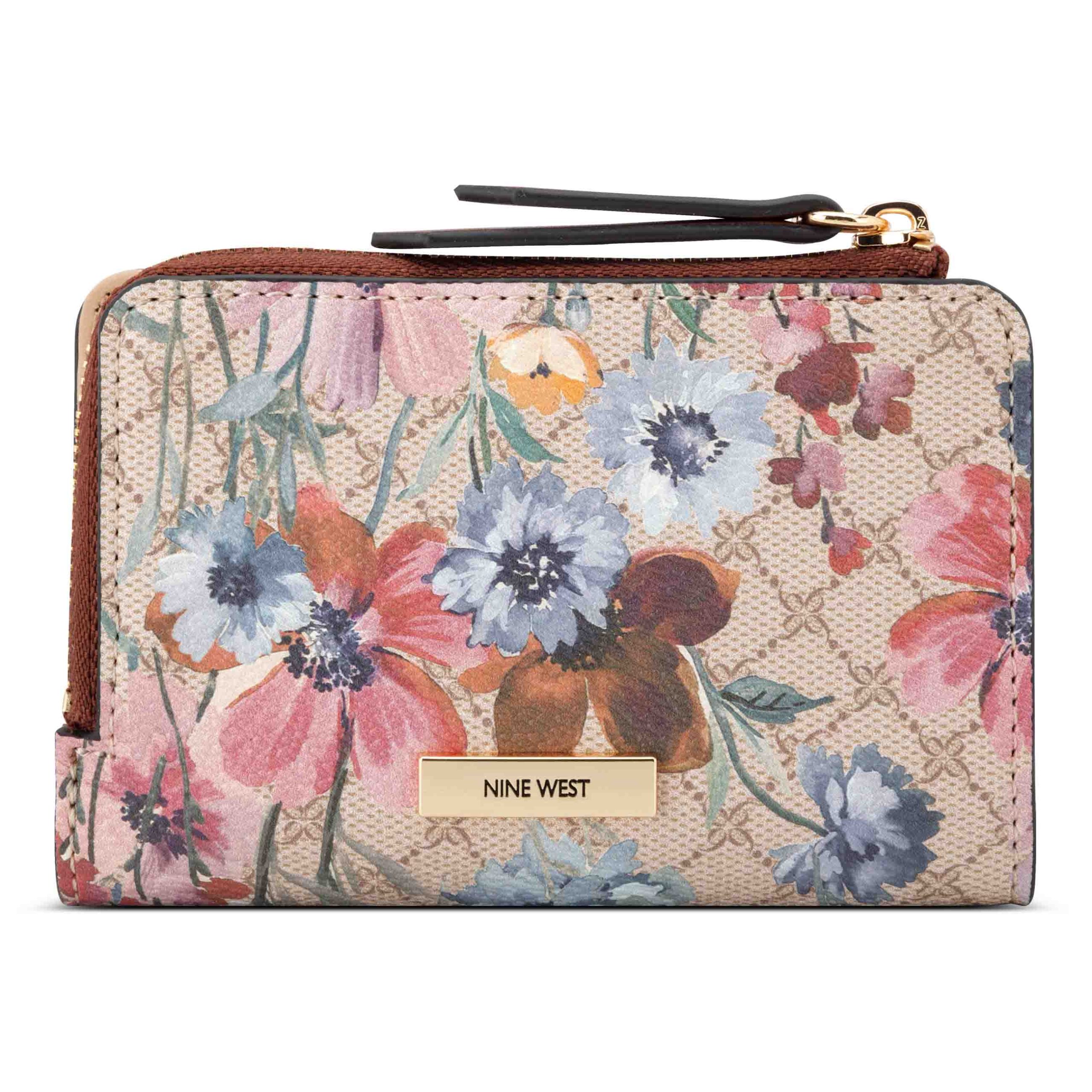 Nine West designer zip around card case with internal slip and zipper pocket organization and external hardware details and branding.