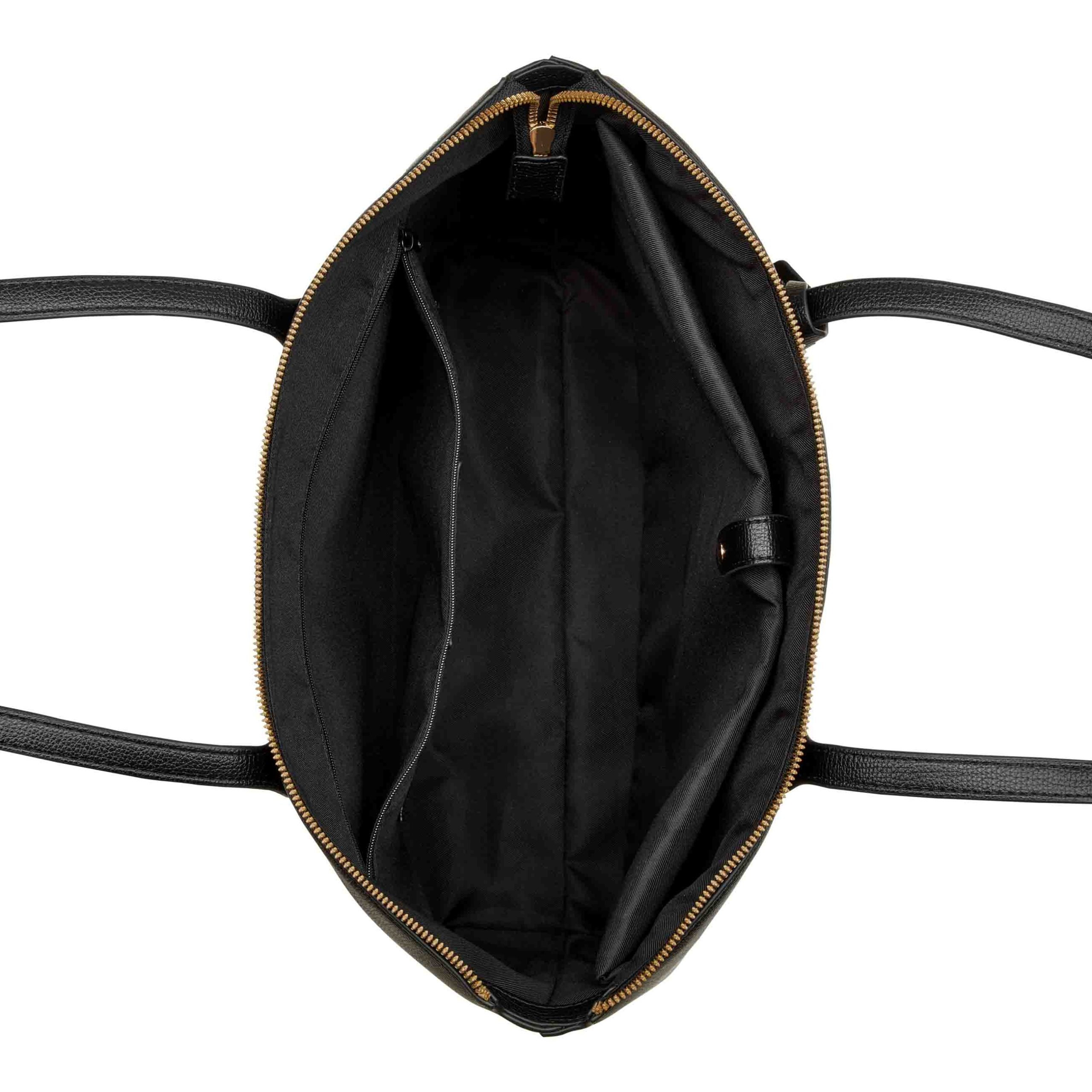 Nine West designer Kyrie laptop tote with internal slip and zipper pocket organization and external hardware details and branding. Full zipper closure and adornment detail.