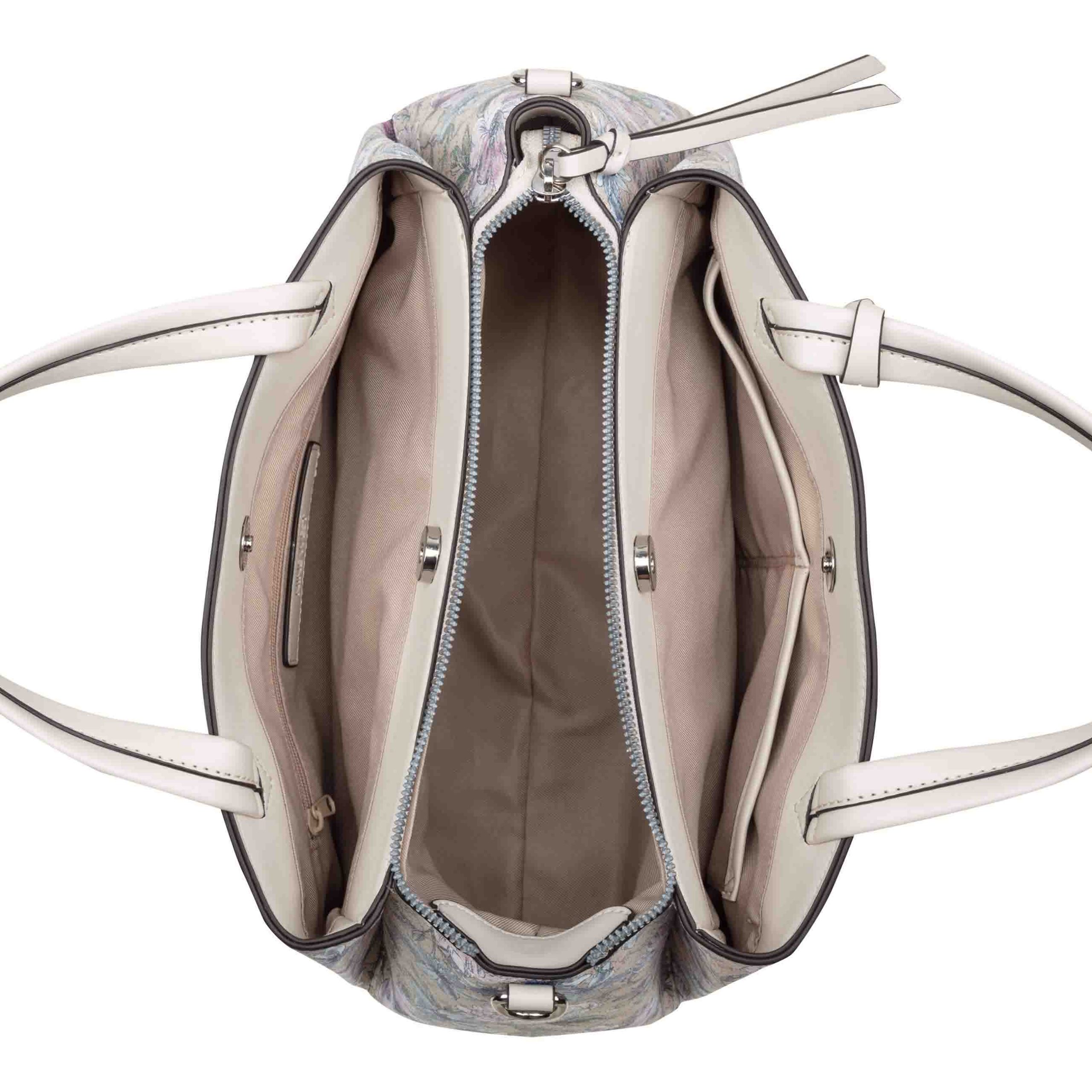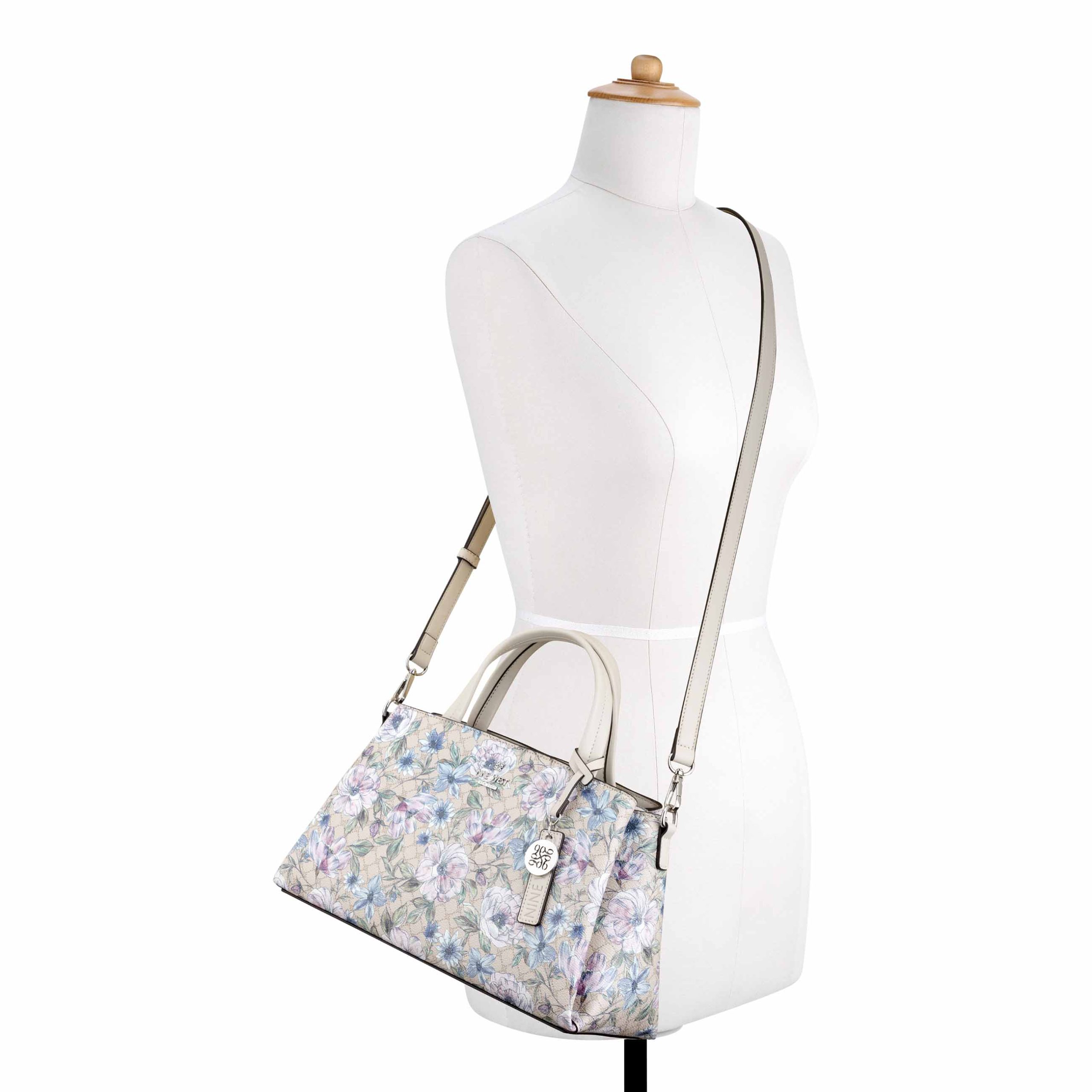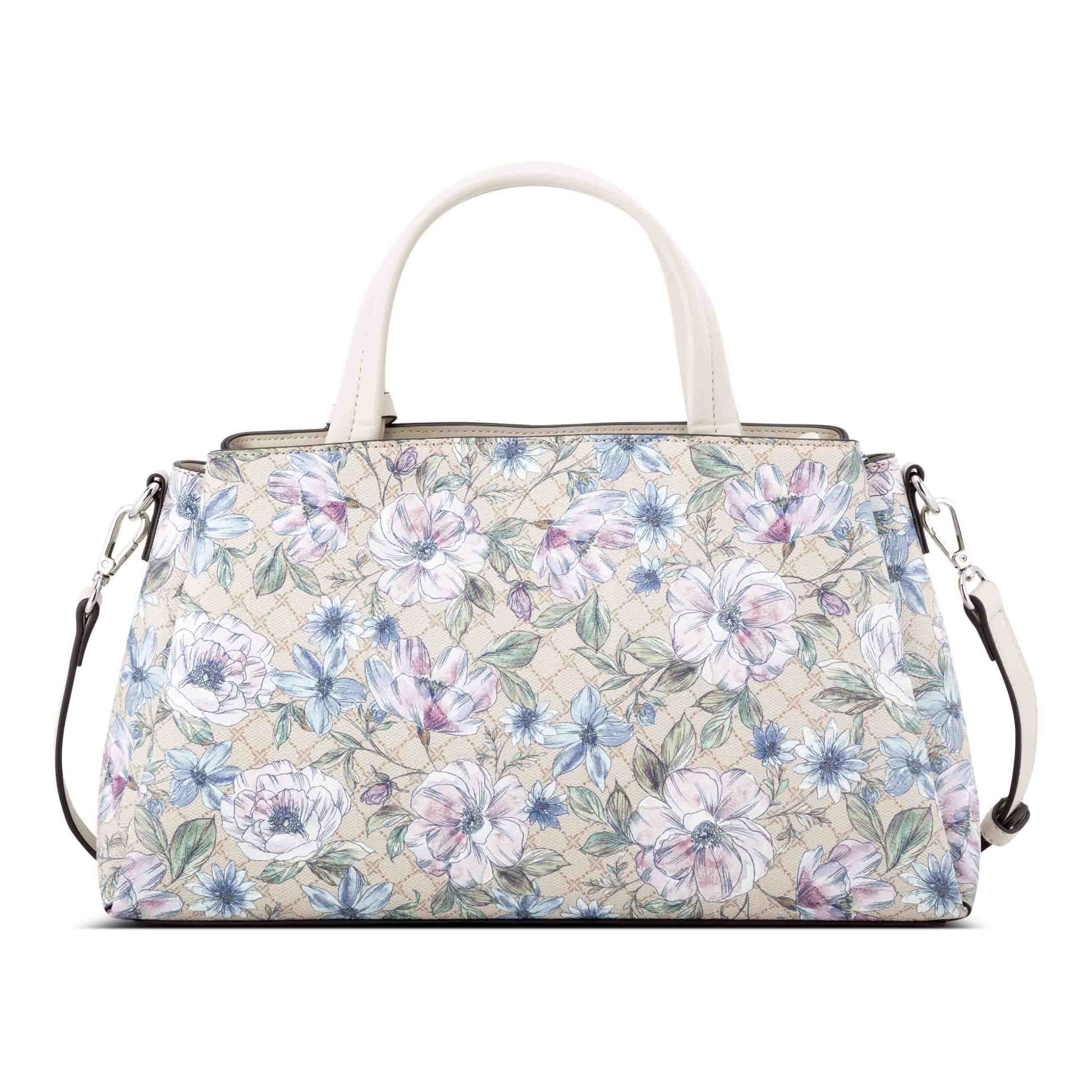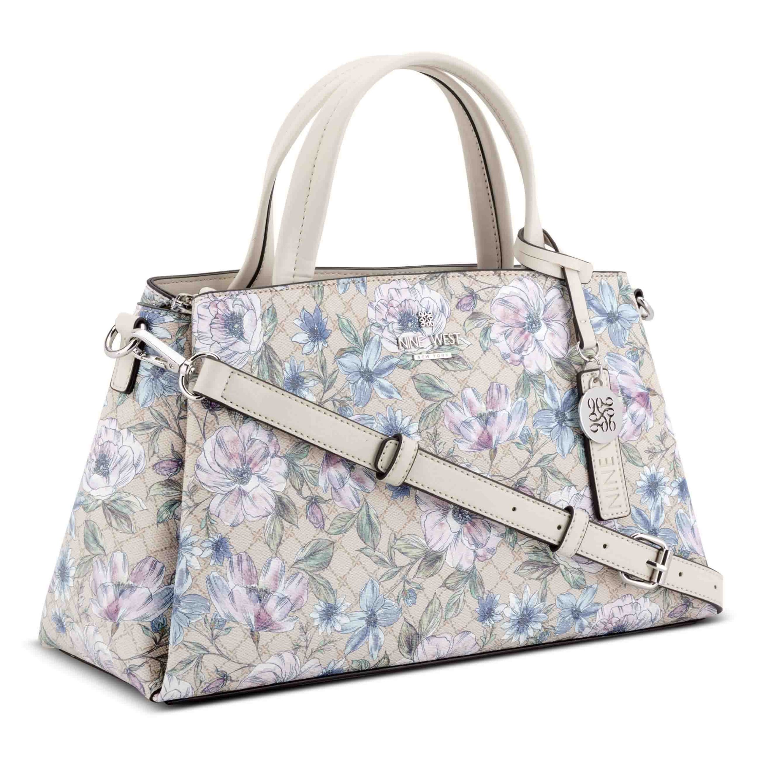 Nine West designer Luela triple compartment satchel with internal slip and zipper pocket organization and external hardware details and branding. Removable crossbody strap to convert to hands free ease.