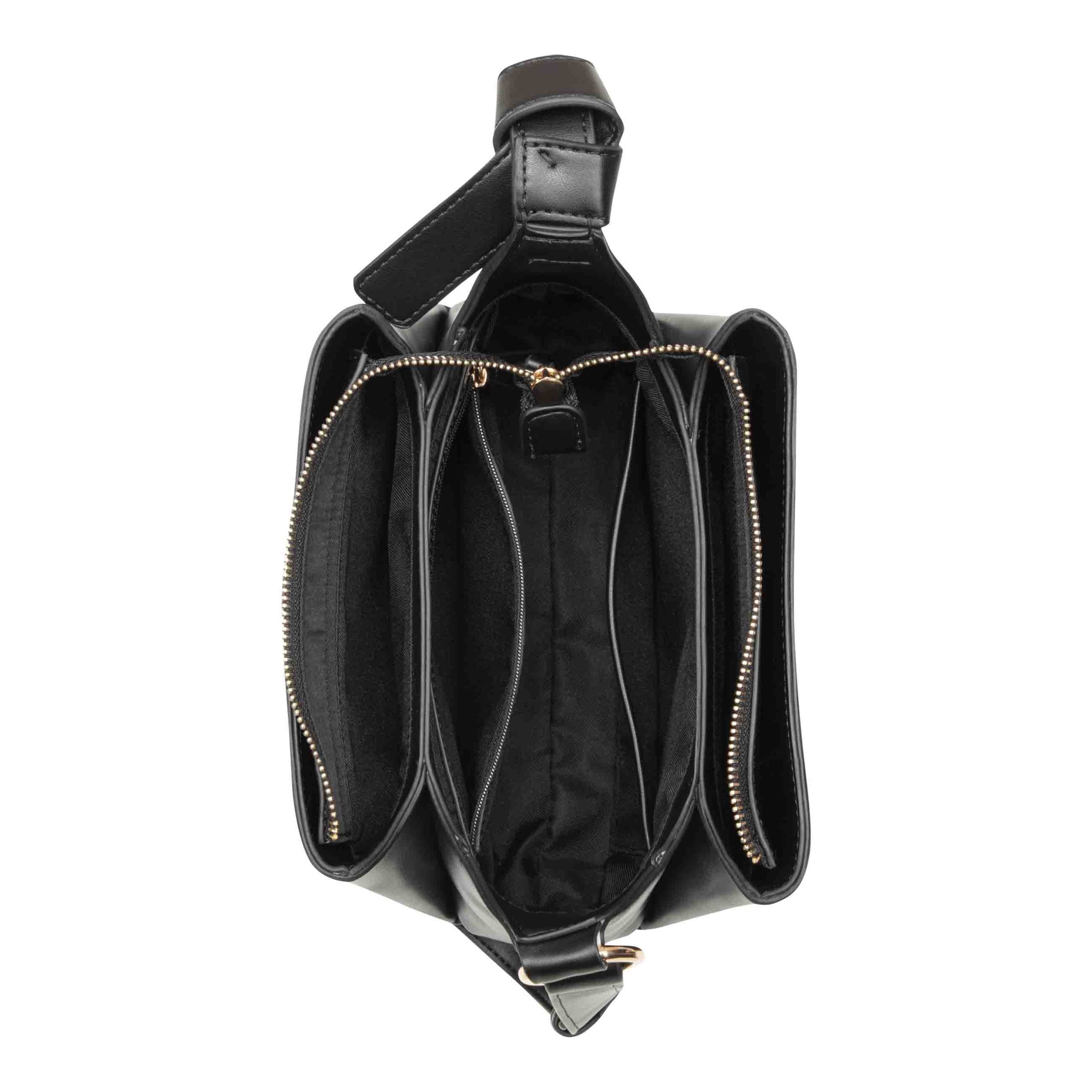 Nine West Designer Lyra crossbody with triple compartment function. Includes an adjustable 22 in shoulder strap. Top zipper with 2 magnetic compartments and interior organization pockets. Special branding with gold and enamel coated finish