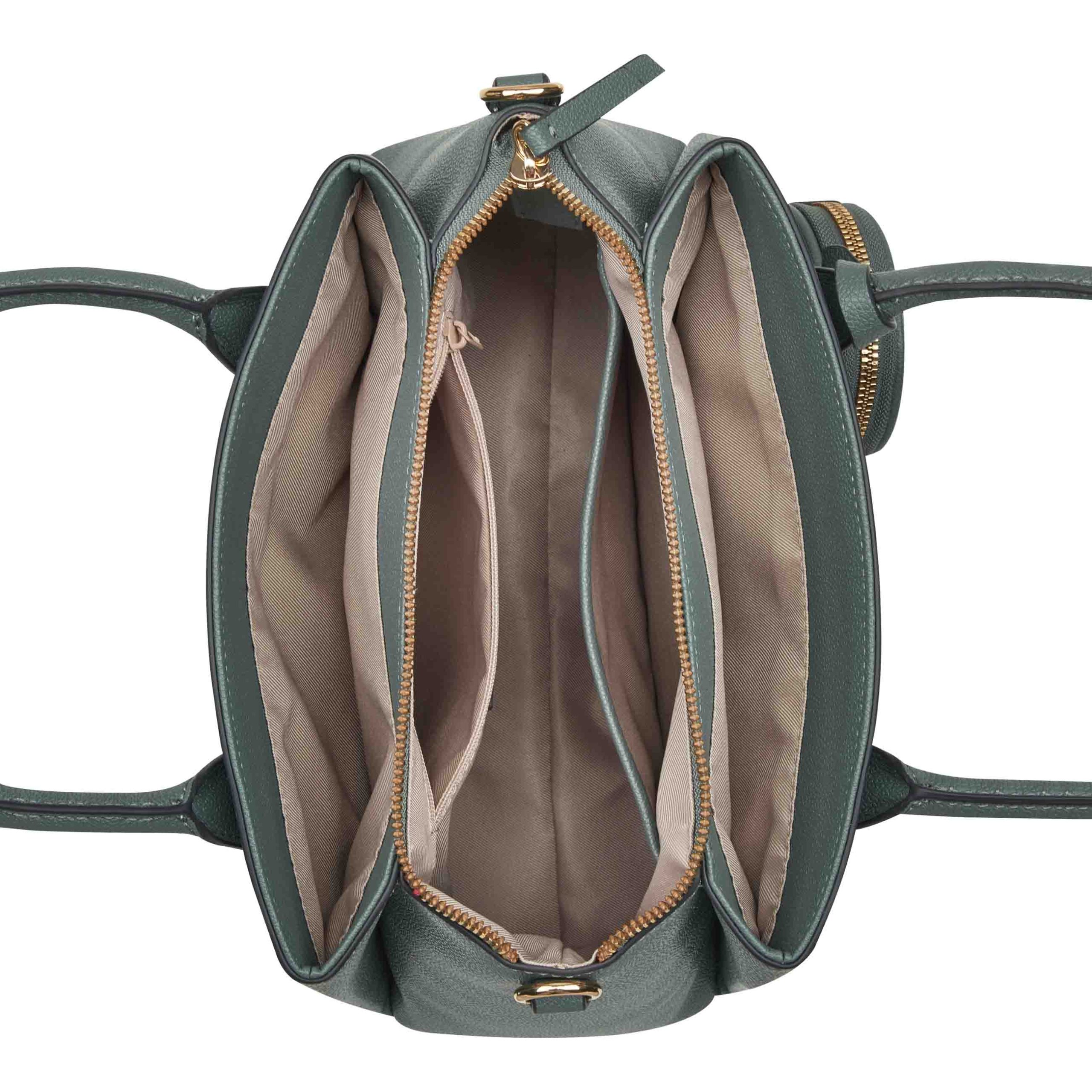 Nine West designer Mary satchel with internal slip and zipper pocket organization and external hardware details and branding