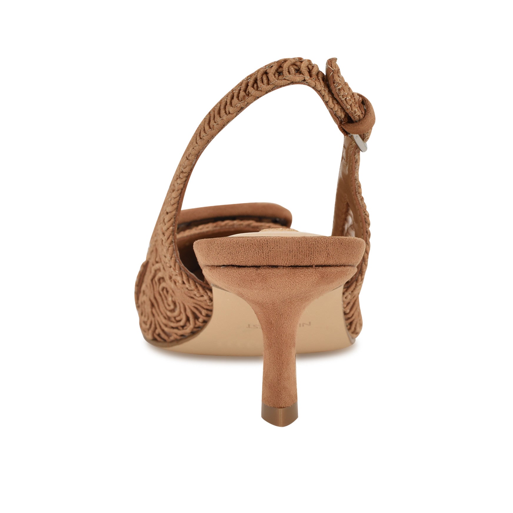 Artisanal texture meets walkable sophistication in the Nolla. a pointed-toe slingback pump with an intricate woven upper layered over sheer mesh for a breezy. dimensional look. An oversized ornamental buckle at the vamp adds a bold finishing detail. while the kitten heel keeps you moving from morning to evening without a second thought.