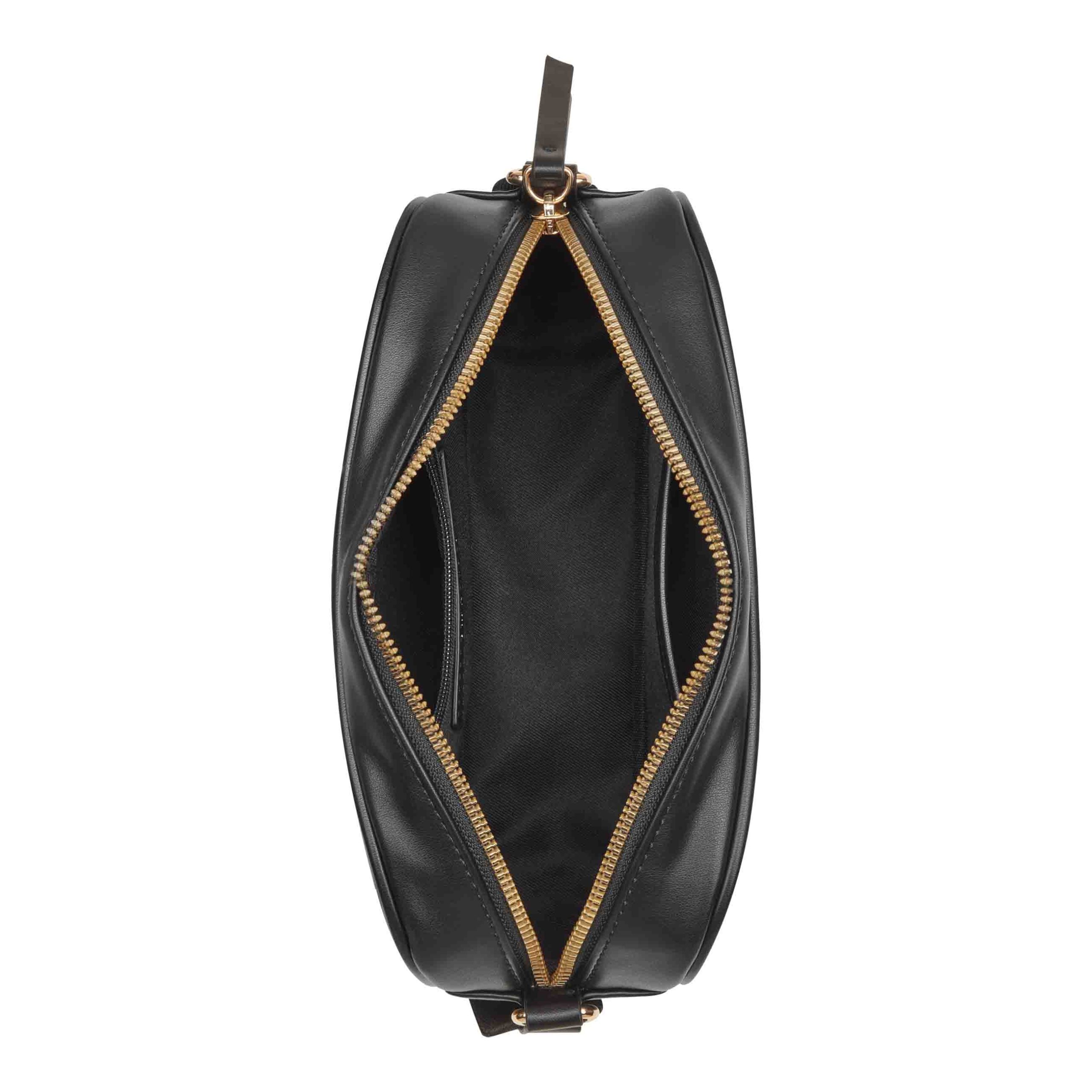 Nine West designer Pauline camera crossbody with internal slip and zipper pocket organization and external hardware details and branding. Designed with web strap fashion strap.