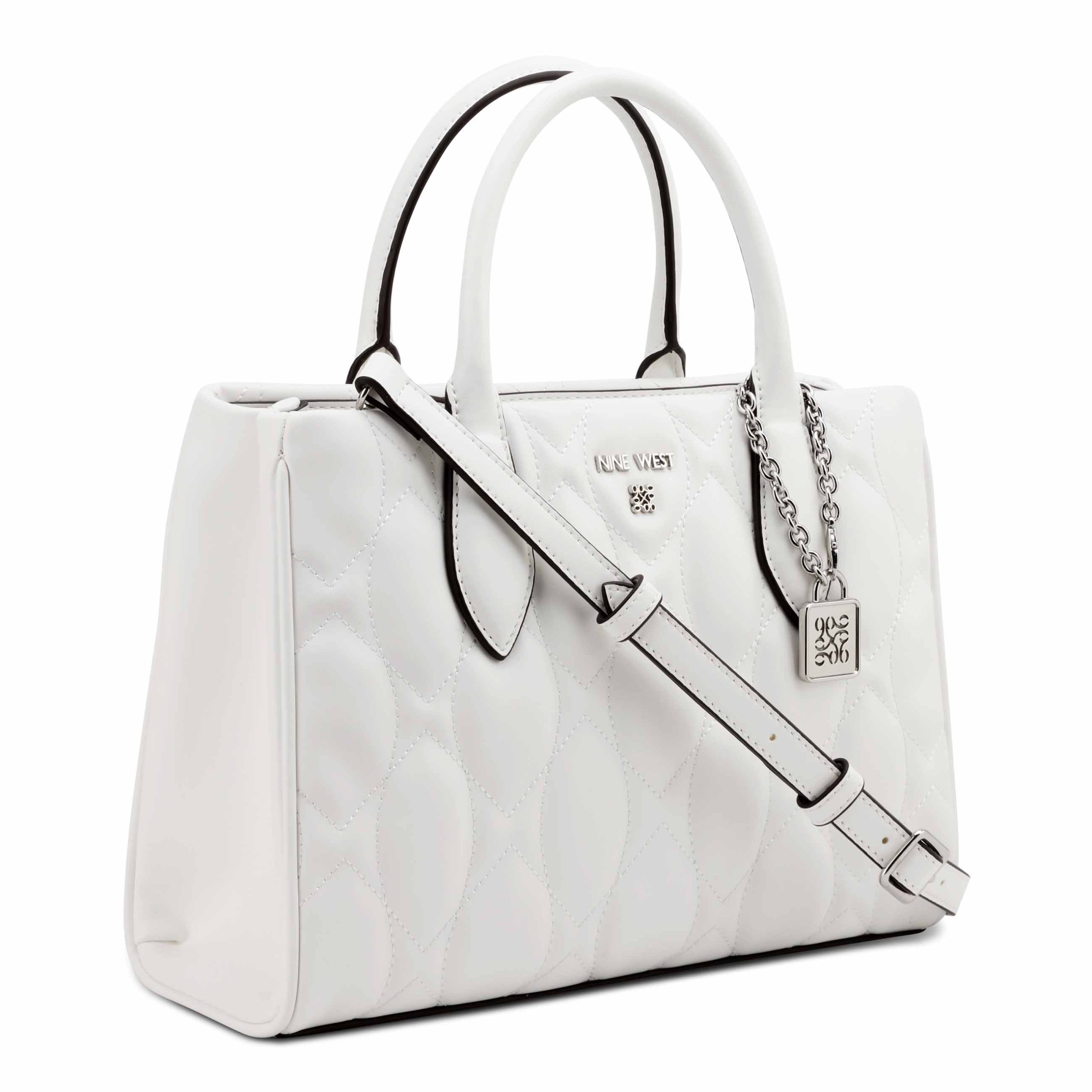 Nine West designer Rue satchel. designed in the soft quilted material and stitching details with hardware detail. Internal slip pocket for organization and stunning chain removable trap for everyday or make it a perfect bag for an occasion. Wear as a satchel bag or hands free as a crossbody with removable strap.