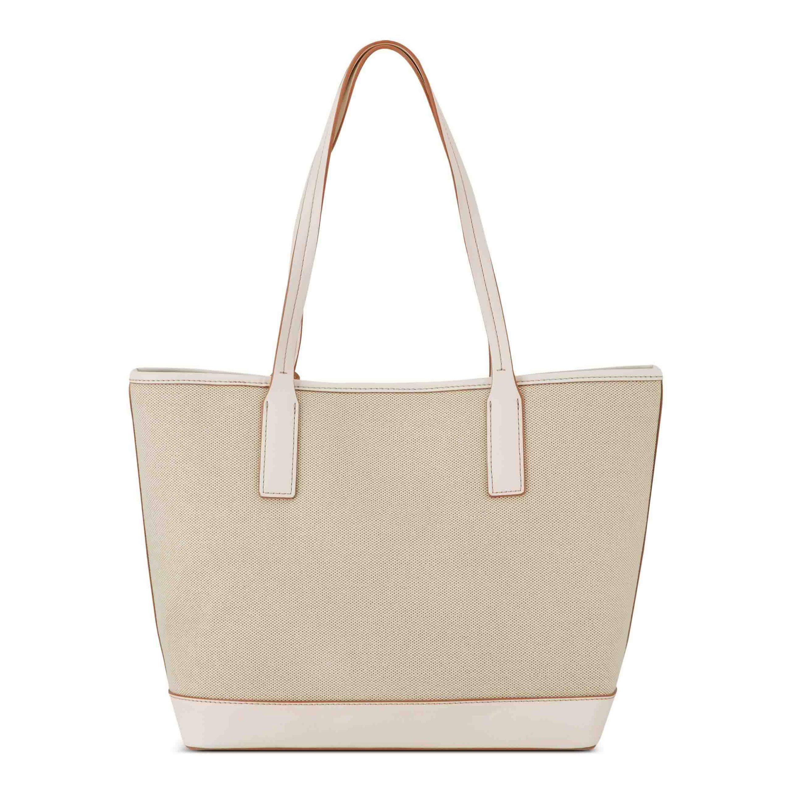 Nine West designer Talley 2 in 1 tote. Designed in beautiful canvas material which elevates your spring and summer look with floral pop adornment. Hardware and elevated branding with internal organization and full zipper closure. Includes removable short shoulder or clutch for an easy going out bag or just to hold essentials when on the go.
