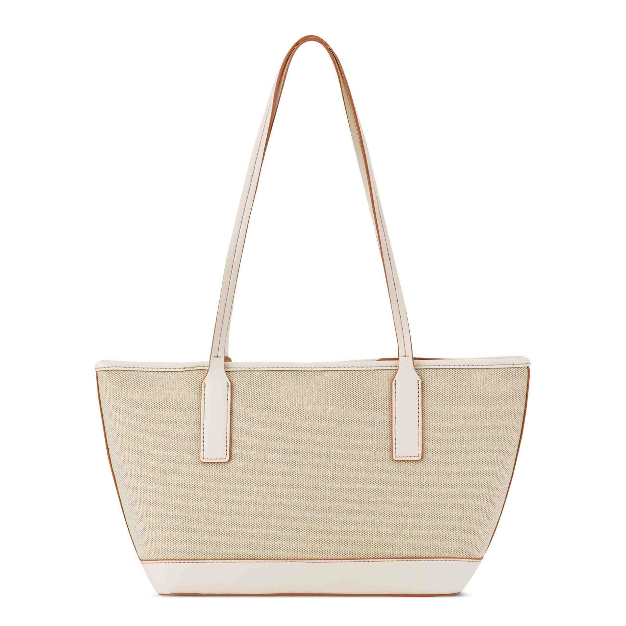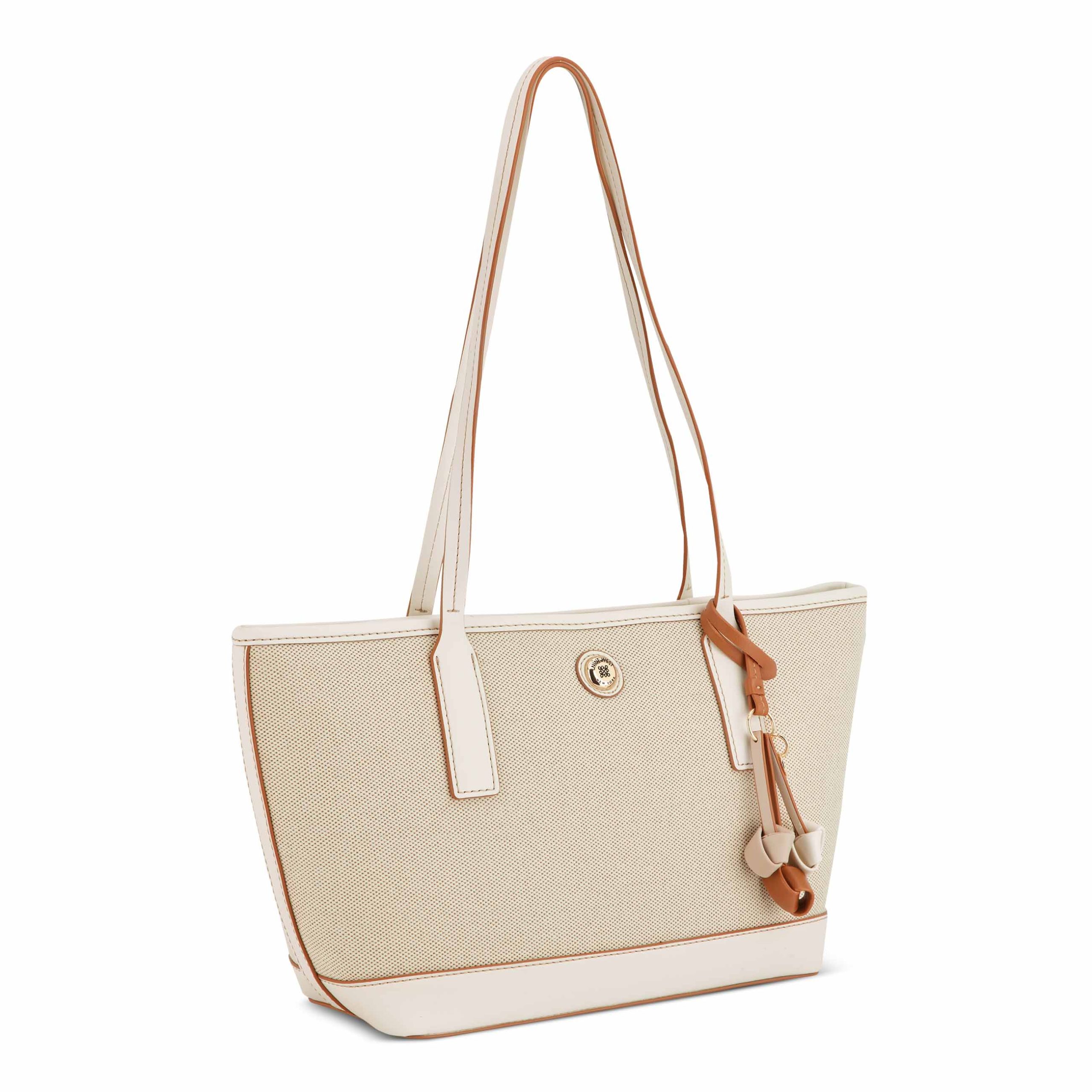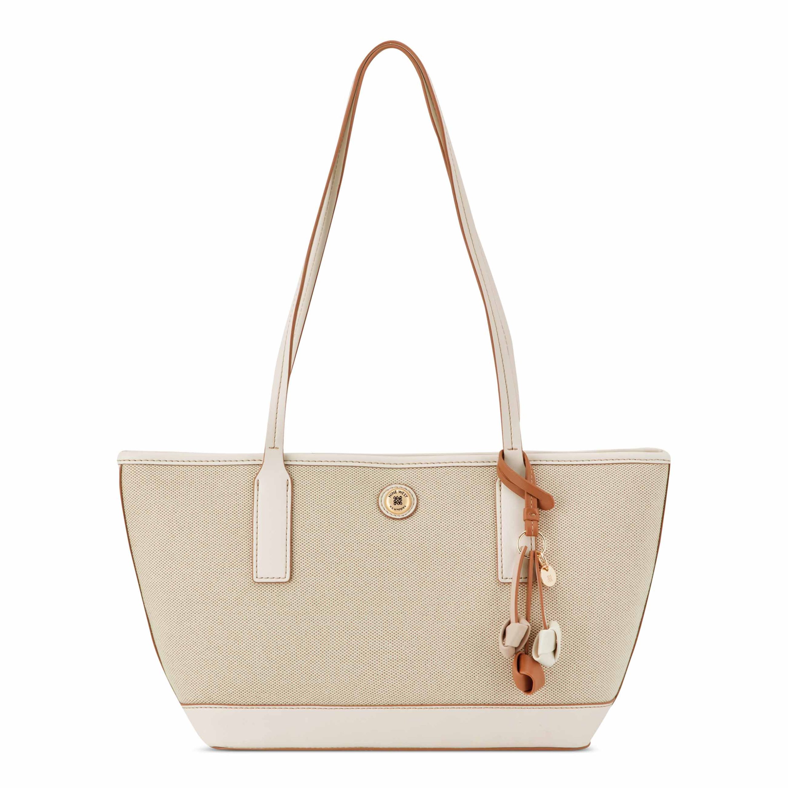 Nine West designer Talley shopper. Designed in beautiful canvas material which elevates your spring and summer look with floral pop adornment. Hardware and elevated branding with internal organization and full zipper closure