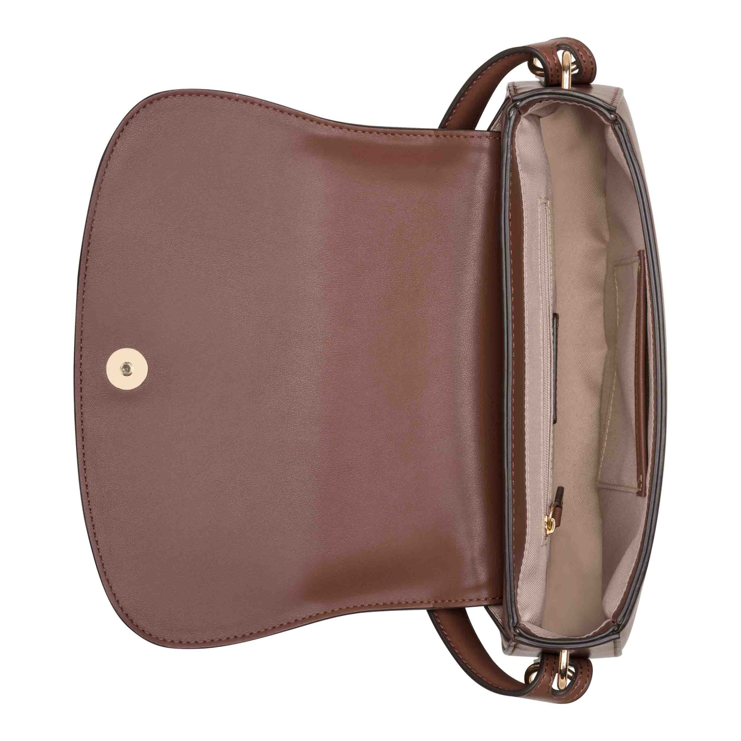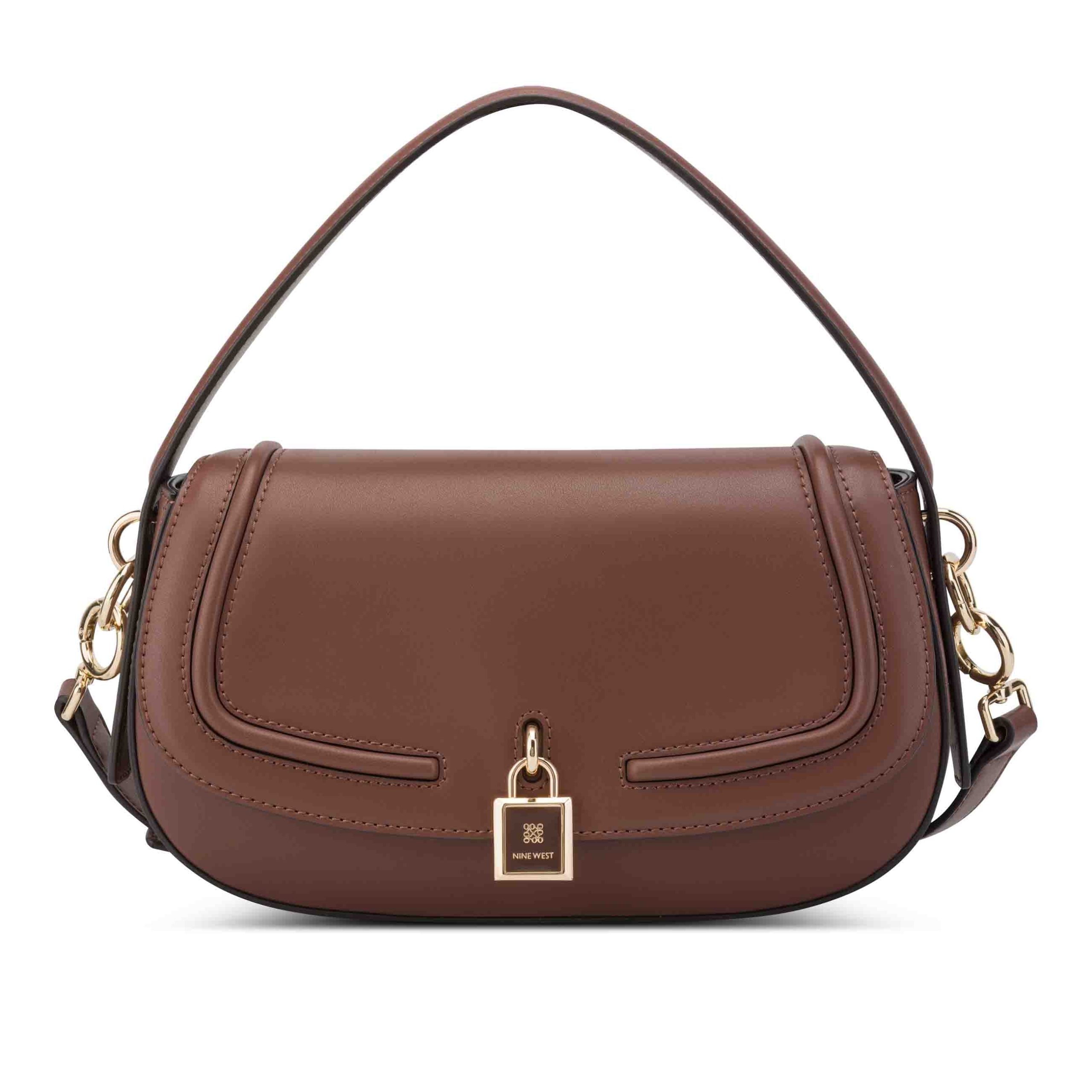 Nine West Tenely flap shoulder bag in softest buttery material. Interior organization pockets and special branding with gold and enamel coated finish. Perfect as top handle bag or hands free crossbody. Features a lock and key adornment detail for luxe style.