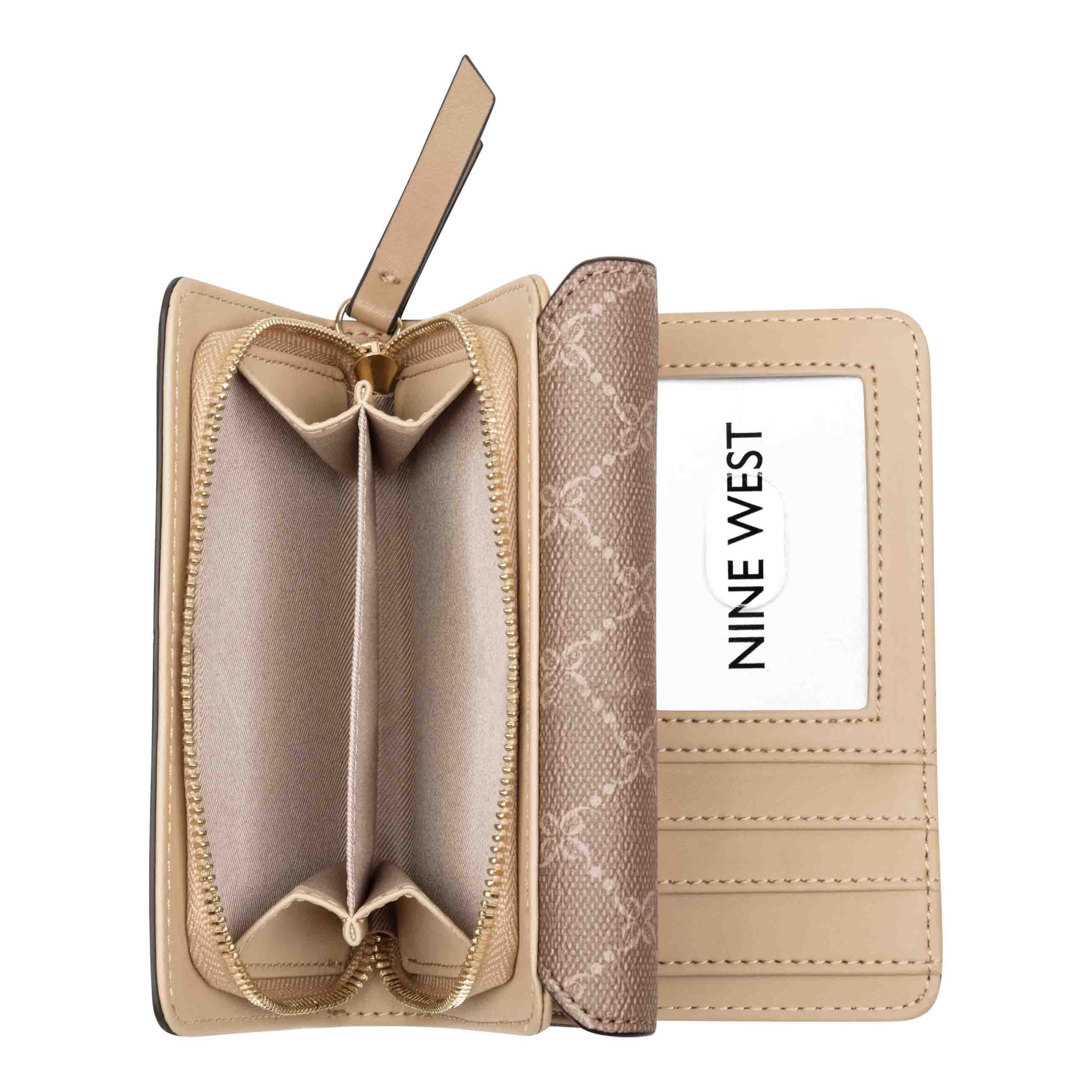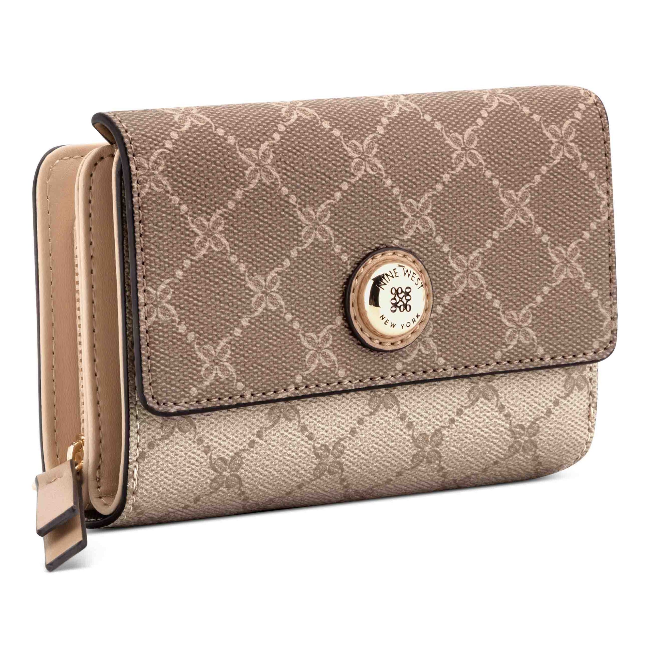 Nine West designer French wallet with internal slip and zipper pocket organization and external hardware details and branding